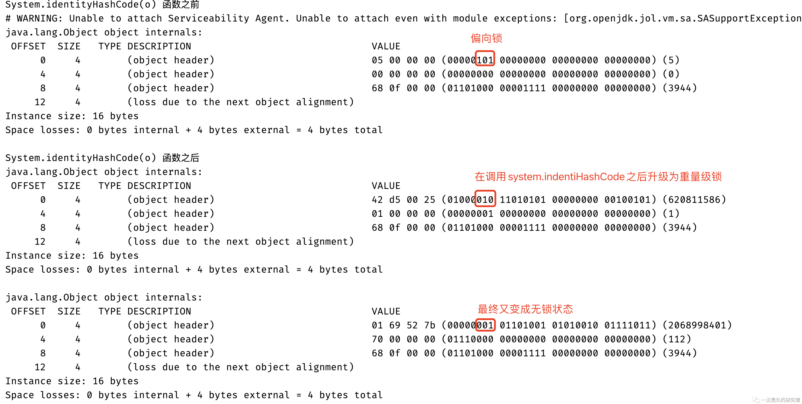上面代码输出结果,下面的红框框住的表示是否是偏向锁和锁标志位(可能你会有疑问为什么是这个位置,不应该是最后3个比特位表示锁相关的状态吗,这个其实是数据表示的大小端问题,大家感兴趣可以去查一下,在这你只需知道红框三个比特就是用于表示是否为偏向锁和锁的标志位):