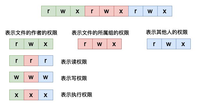 表示,则说明有对应的权限。这9个字符每三个字符是一组,第一组表示文件的作者的权限,第二组表示作者所在组内的其他人的权限,第三组表示其他人的权限,也就是除了作者和作者所在的组之外的其他人的权限。
