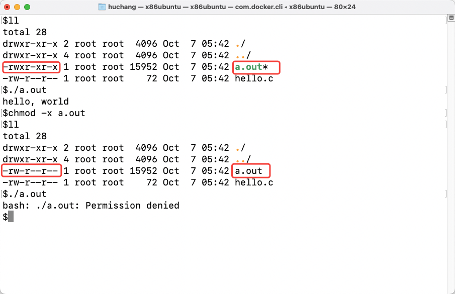 比如在上图当中有一个可执行文件a.out,但是当我们使用chmod命令将他的所有的可执行权限都删掉的时候他就不可以被执行了,程序输出的结果表示没有权限。在没有修改之前,作者、组和其他人的权限为-rwxr-xr-x