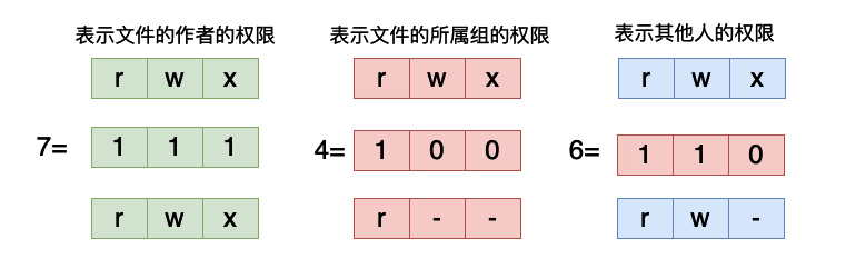 - 在上面的例子当中我们还使用数组去表示权限,因为不管是那中类型的用户都有三种权限,每一种权限有具有两种状态,有这个权限和没有这个权限。那么每一个位置都可以使用一个二进制位进行表示,当二进制位为1的时候就说明有这个权限,为0的时候就没有这个权限。那么三个二进制位就表示一类用户(作者、组和其他),因此每一个用户的权限我们可以用三个二进制数进行表示,比如在上图当中的