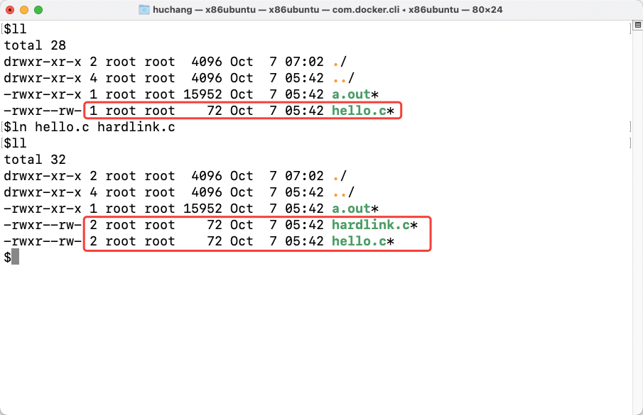 -rw-r--r-- 3 root root 72 Aug 26 15:32 hello.c